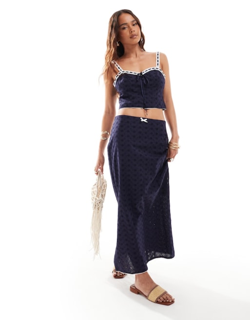 Stradivarius - STR - Coordinato con top con scollo a cuore e gonna midi blu navy