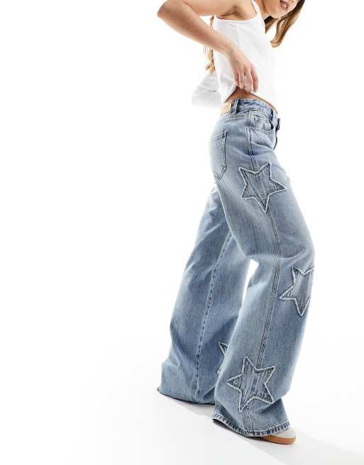 Stradivarius - STR - Jeans a fondo ampio blu medio con toppe a forma di stelle
