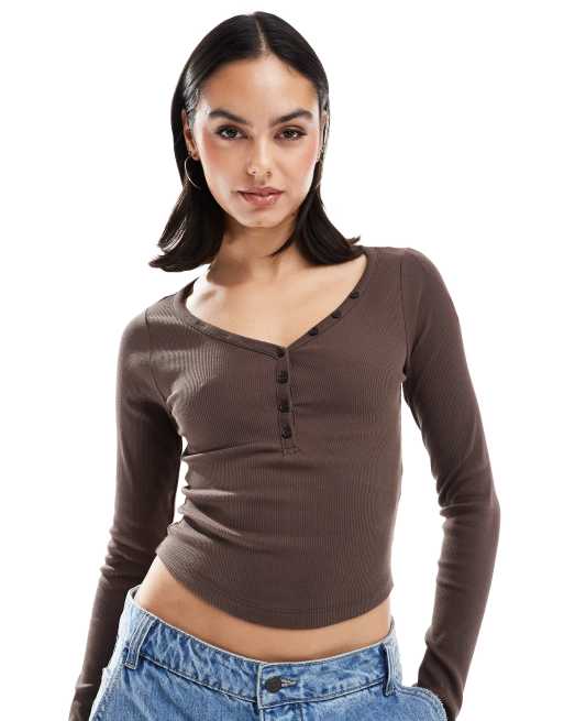 Stradivarius - STR - Top marrone a coste con bottoni