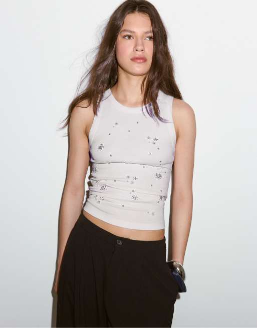 Stradivarius - T-shirt bianca con dorso a vogatore e strass