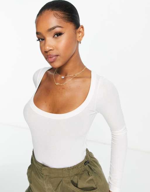 Stradivarius - Top a maniche lunghe bianco a coste con scollo rotondo