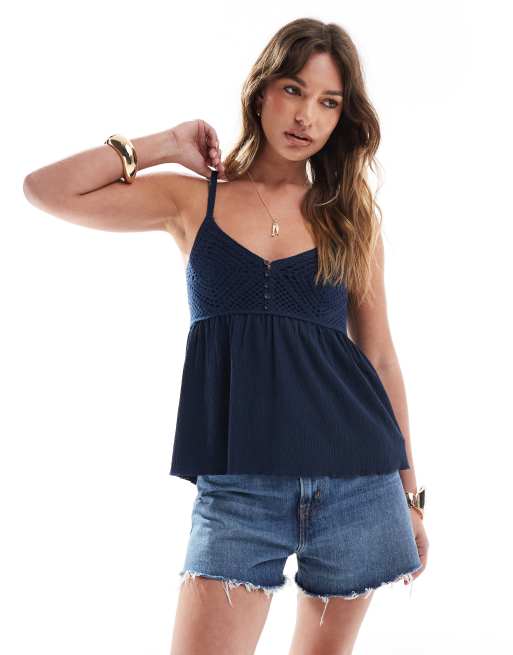 Stradivarius - Top blu navy all'uncinetto con volant