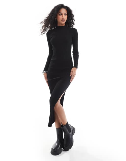 Stradivarius - Vestito midi nero in maglia con spacco laterale