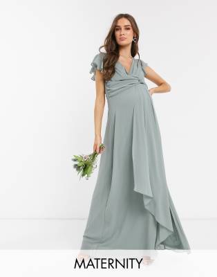 TFNC Maternity - Vestito lungo da damigella salvia con maniche a volant
