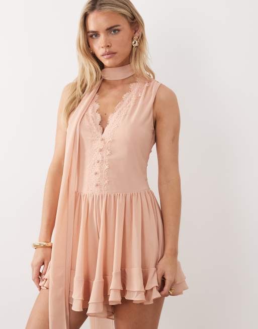 TFNC Petite - Tuta corta con scollo a V basso in chiffon e pizzo rosa chiaro con sciarpa