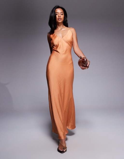 TFNC Petite - Vestito lungo color ruggine in raso con scollo ad anello