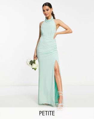 TFNC Petite - Vestito lungo da damigella accollato in chiffon verde salvia fresco allacciato sul retro