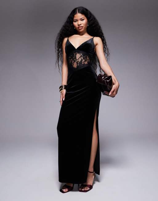 TFNC Petite - Vestito lungo in velluto nero con inserto in pizzo e scollo profondo