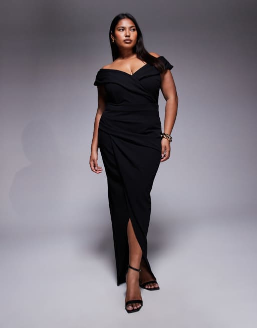 TFNC Plus - Vestito al polpaccio avvolgente con scollo Bardot nero