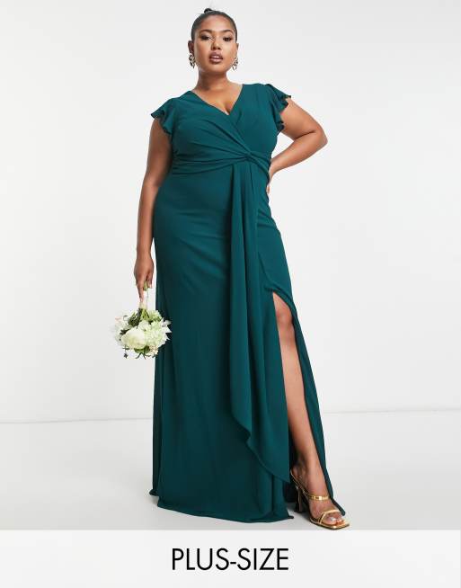 TFNC Plus - Vestito lungo da damigella color smeraldo con maniche con volant