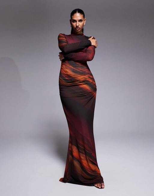 TFNC - Vestito lungo a maniche lunghe in tessuto a rete con stampa