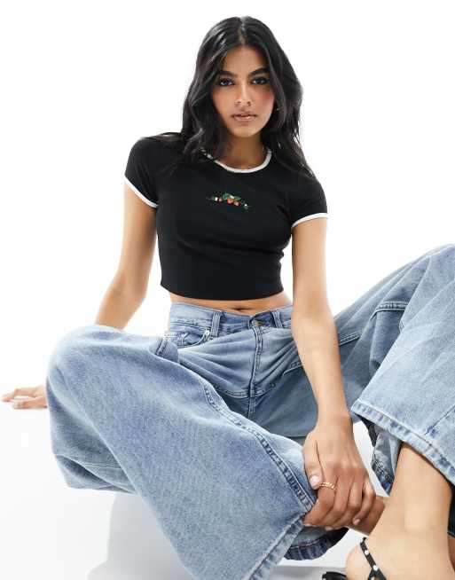 Esclusiva The Frolic - T-shirt mini nera con finiture a contrasto e motivo con fragole