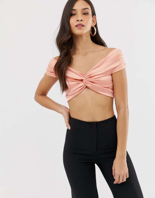 The Girlcode - Top corto a incrocio in raso elasticizzato con scollo alla Bardot rosa