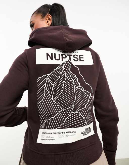 The North Face - Nuptse - Felpa con cappuccio corta marrone in pile con stampa sul retro