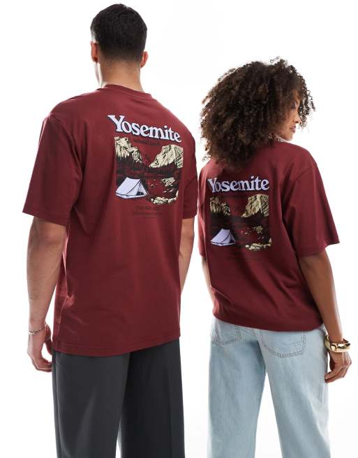 The North Face - T-shirt oversize bordeaux con stampa di cartolina "Yosemite" sul retro