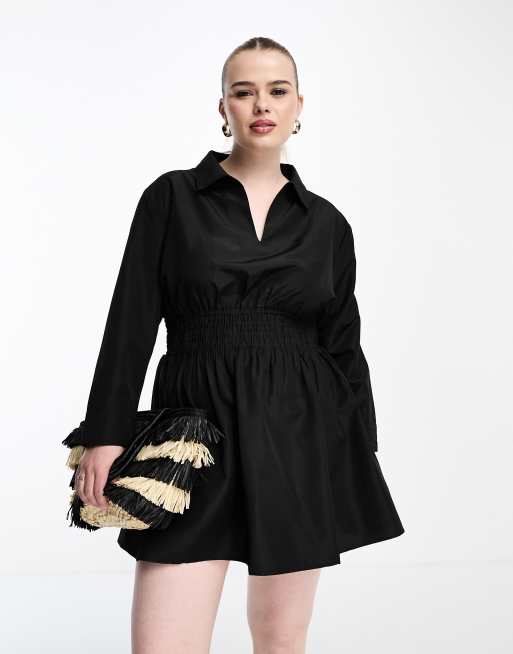 Threabdare Plus - Vestito camicia in popeline nero con vita arricciata