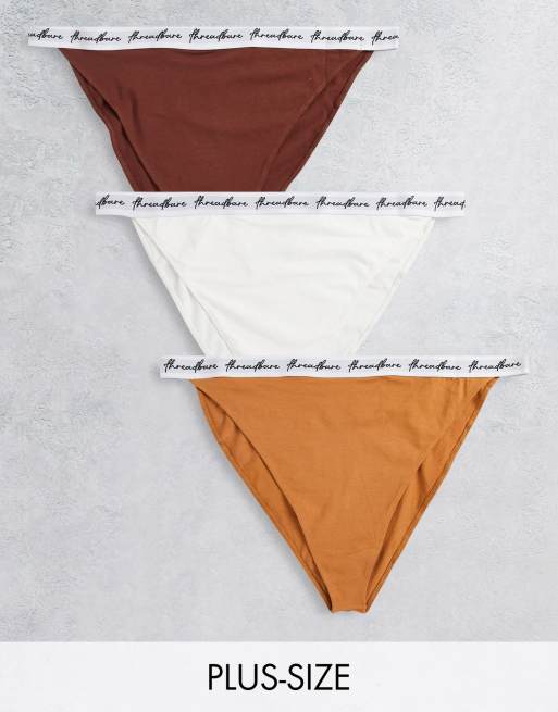 Threadbare Plus - Confezione da 3 paia di slip stile tanga crema, cuoio e marrone con logo
