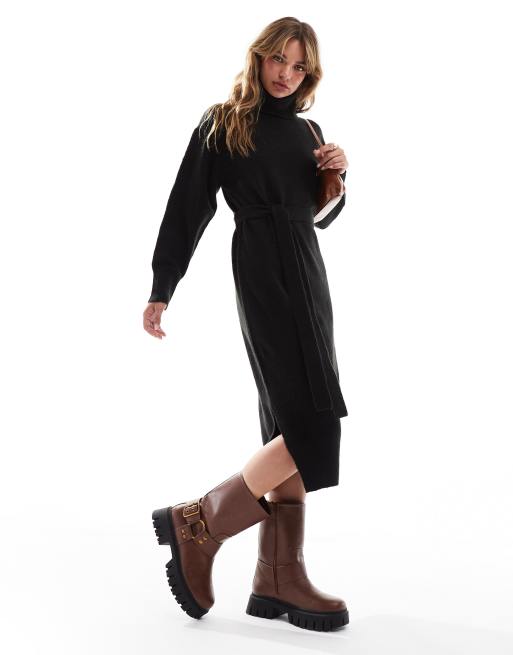 Threadbare - Vestito maglia midi nero allacciato in vita con collo alto