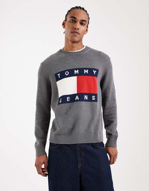 Tommy Jeans - Maglione grigio mélange con bandiera