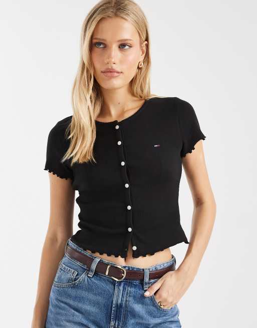 Tommy Jeans - T-shirt nera a coste con bottoni