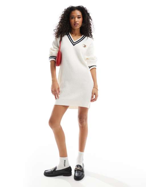 Tommy Jeans - Vestito maglia bianco con scollo a V e stemma