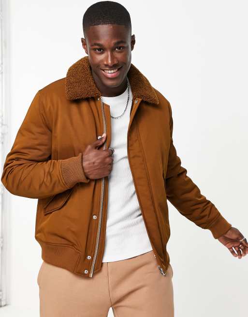 Topman - Bomber con colletto in pile borg marrone chiaro