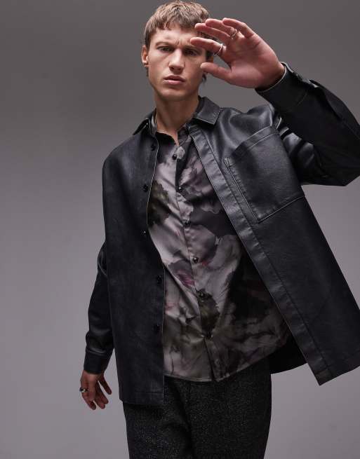 Topman - Camicia giacca a maniche lunghe in pelle sintetica invecchiata grigia