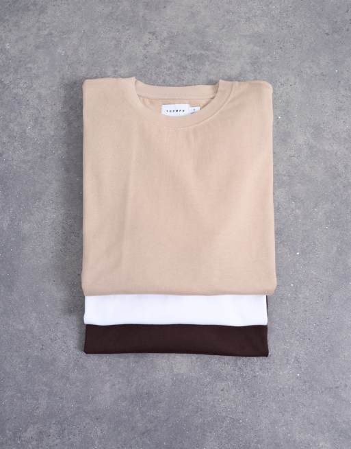 Topman - Confezione da 3 T-shirt comode bianca, color cioccolato e pietra