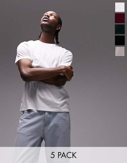 Topman - Confezione da 5 t-shirt classiche nera, bianca, écru, bordeaux e verde scuro