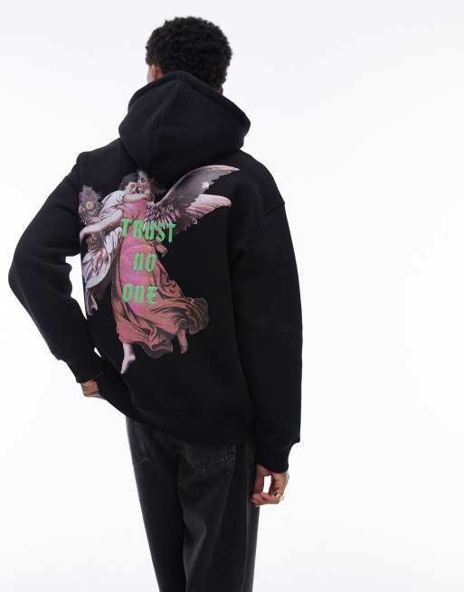 Topman - Felpa con cappuccio oversize nera con stampa di angeli sul davanti e sul retro
