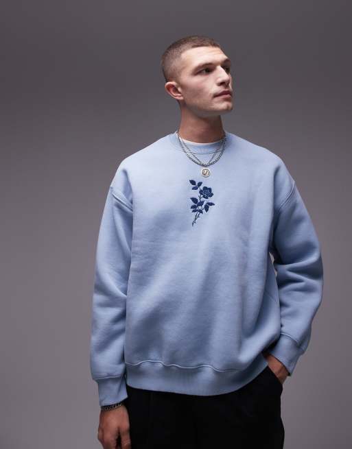 Topman - Felpa oversize con ricamo a fiori blu slavato