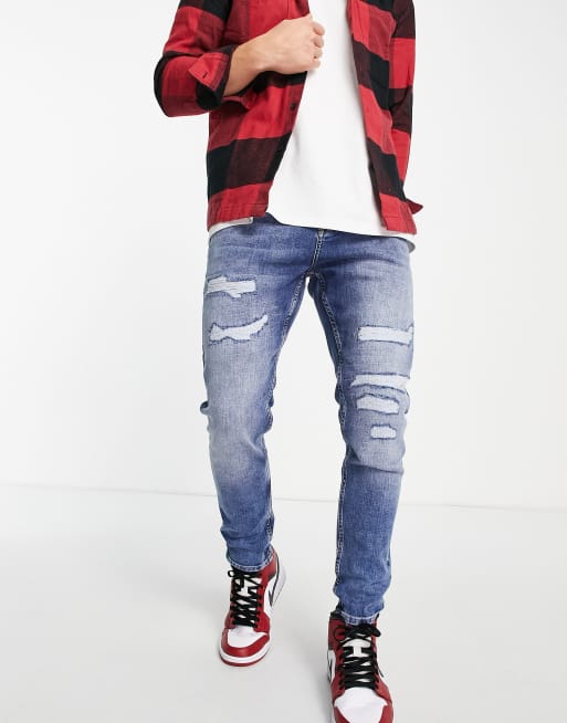 Topman - Jeans affusolati con strappi e rammendi lavaggio scuro