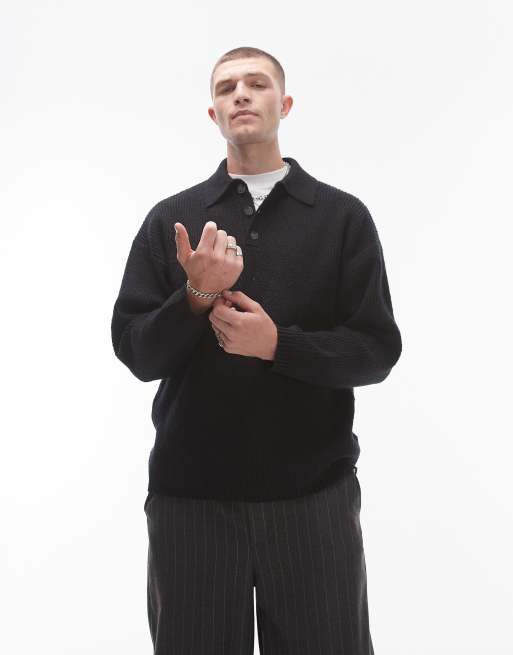 Topman - Maglione comodo nero stile polo in maglia compatta