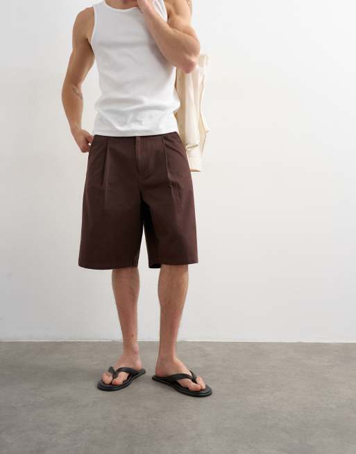 Topman - Pantaloncini bermuda in twill marrone con pieghe