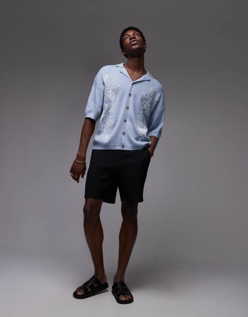 Topman - Polo blu con doppio fiore ricamato e rever