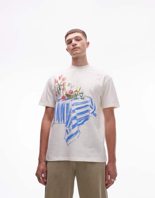 Topman - T-shirt oversize écru con disegno di tavola apparecchiata