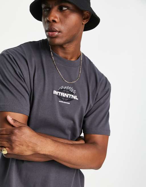 Topman - T-shirt oversize grigio scuro con ricamo "International"