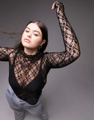 Topshop Curve - Top accollato a maniche lunghe in pizzo nero