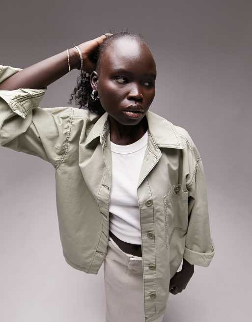 Topshop Petite - Camicia giacca oversize in cotone leggero kaki