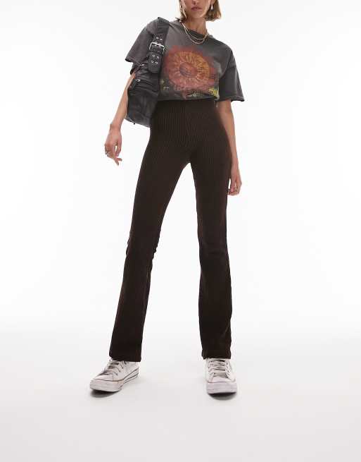 Topshop Petite - Pantaloni a zampa elasticizzati in velluto a coste marrone cioccolato