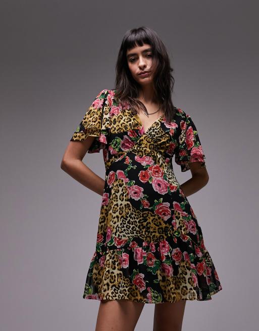 Topshop - Bella - Vestito da giorno con maniche a pipistrello con stampa di rose rosa e pois
