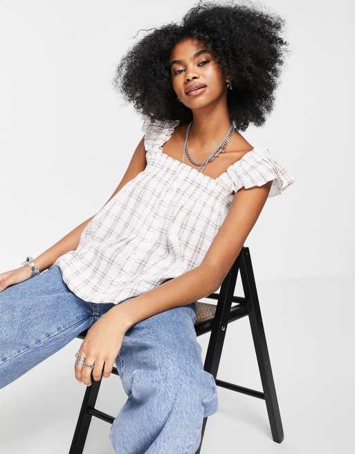 Topshop - Canottiera con volant sulle maniche a quadretti pastello