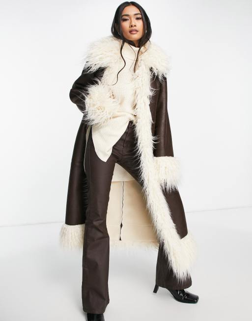 Topshop - Cappotto lungo in camoscio sintetico marrone con finiture in pelliccia sintetica