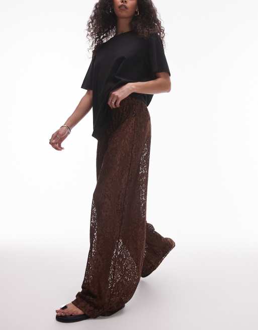 Topshop - Coordinato con top senza maniche e pantaloni a fondo ampio in pizzo marrone