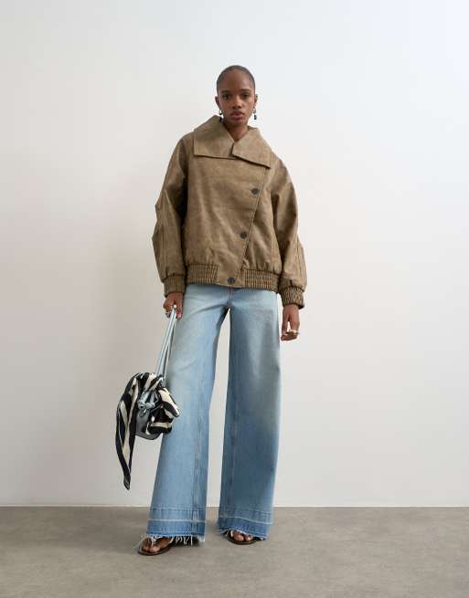 Topshop - Giacca bomber asimmetrica oversize in pelle sintetica marrone slavato con collo a imbuto