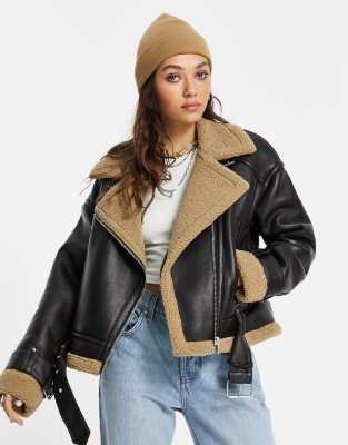 Topshop - Giacca stile aviatore in montone sintetico marrone con fodera in pile borg