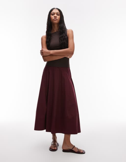 Topshop - Gonna lunga bordeaux con vita scesa e design combinato