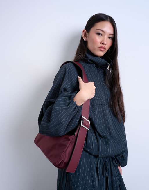 Topshop - Kylie - Borsa a tracolla media in nylon bordeaux con tracolla a contrasto