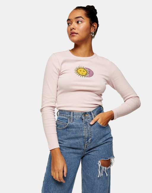 Topshop - Maglietta a maniche lunghe rosa con grafica di sole e luna