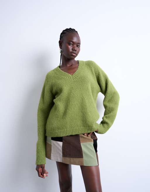 Topshop - Maglione soffice lavorato in misto lana con scollo a V verde